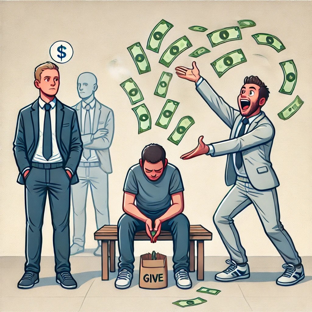 This somewhat ridiculous AI image illustrates the point of the extremes–the two vices. The man on the left who fears being taken advantage of and never gives any money. And the man on the right who recklessly throws his money around without any scrutiny even possibly to a grifter.